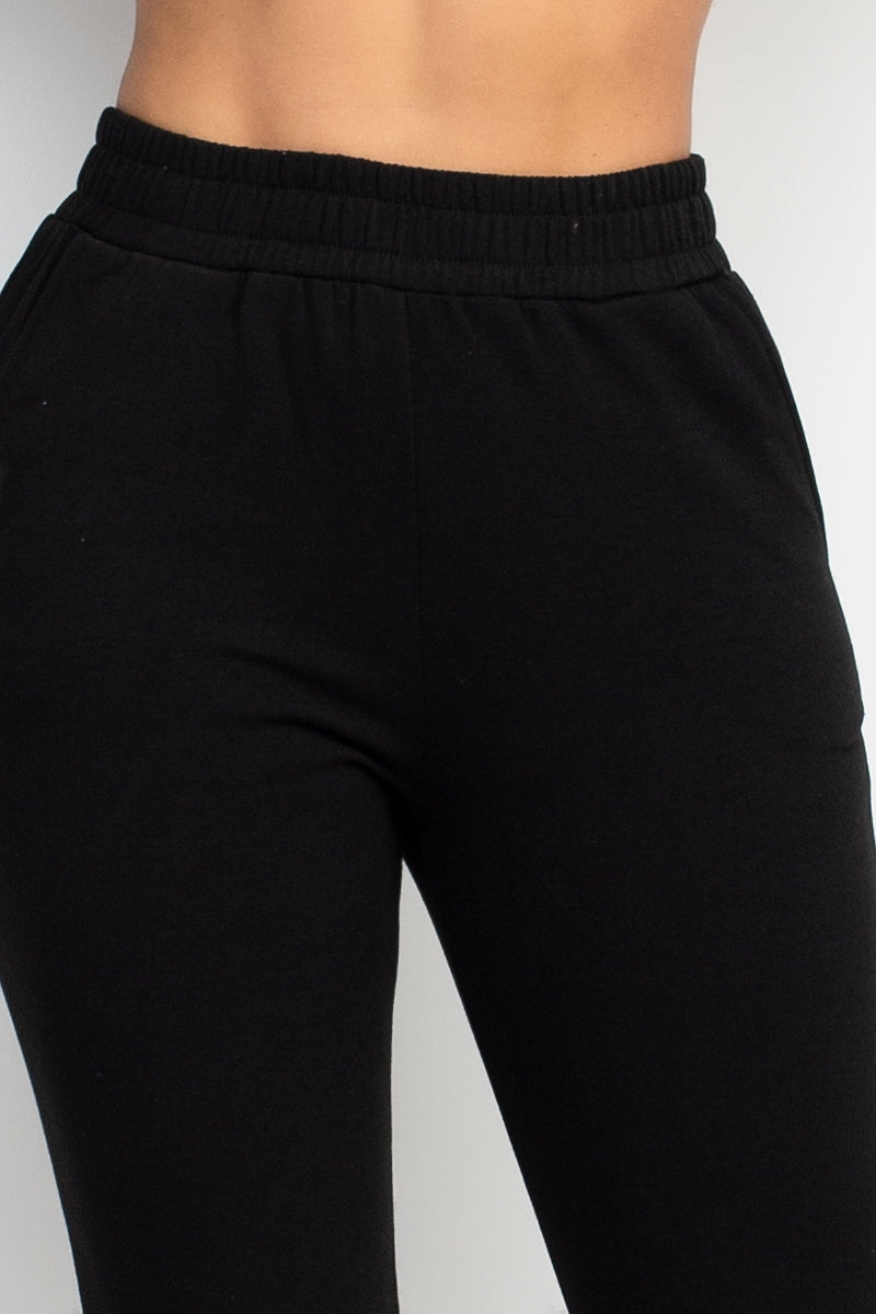 A solid pair of jogger pants featuring an elastic material, a high waist, side pockets, and a full length.