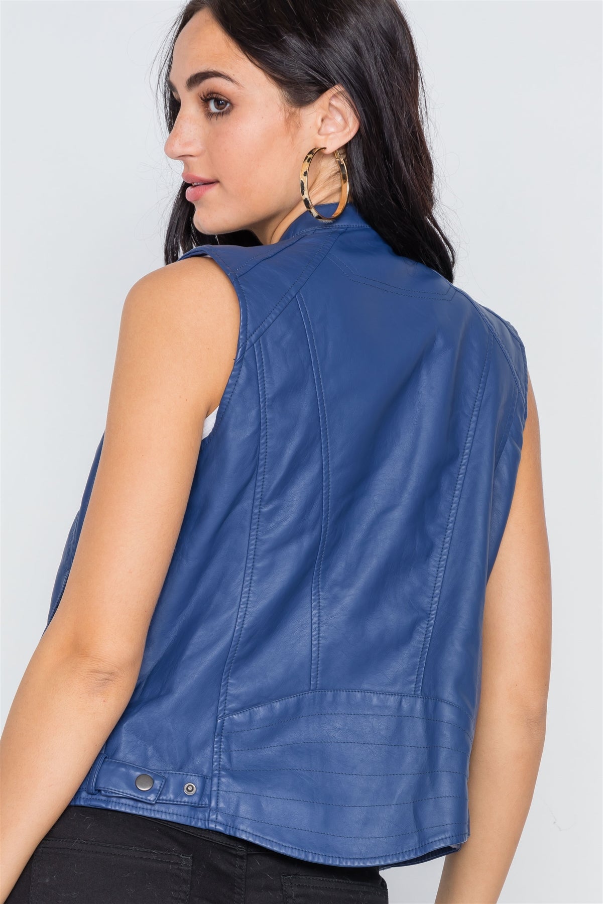 Blue Vegan Leather Faux Fur Lining Triple Zip-up Detail Moto Vest